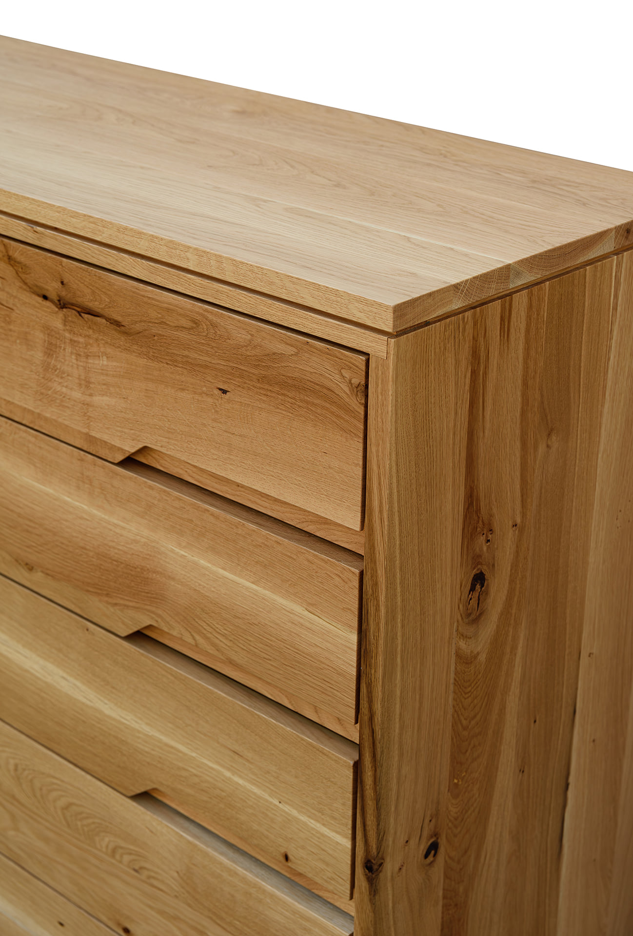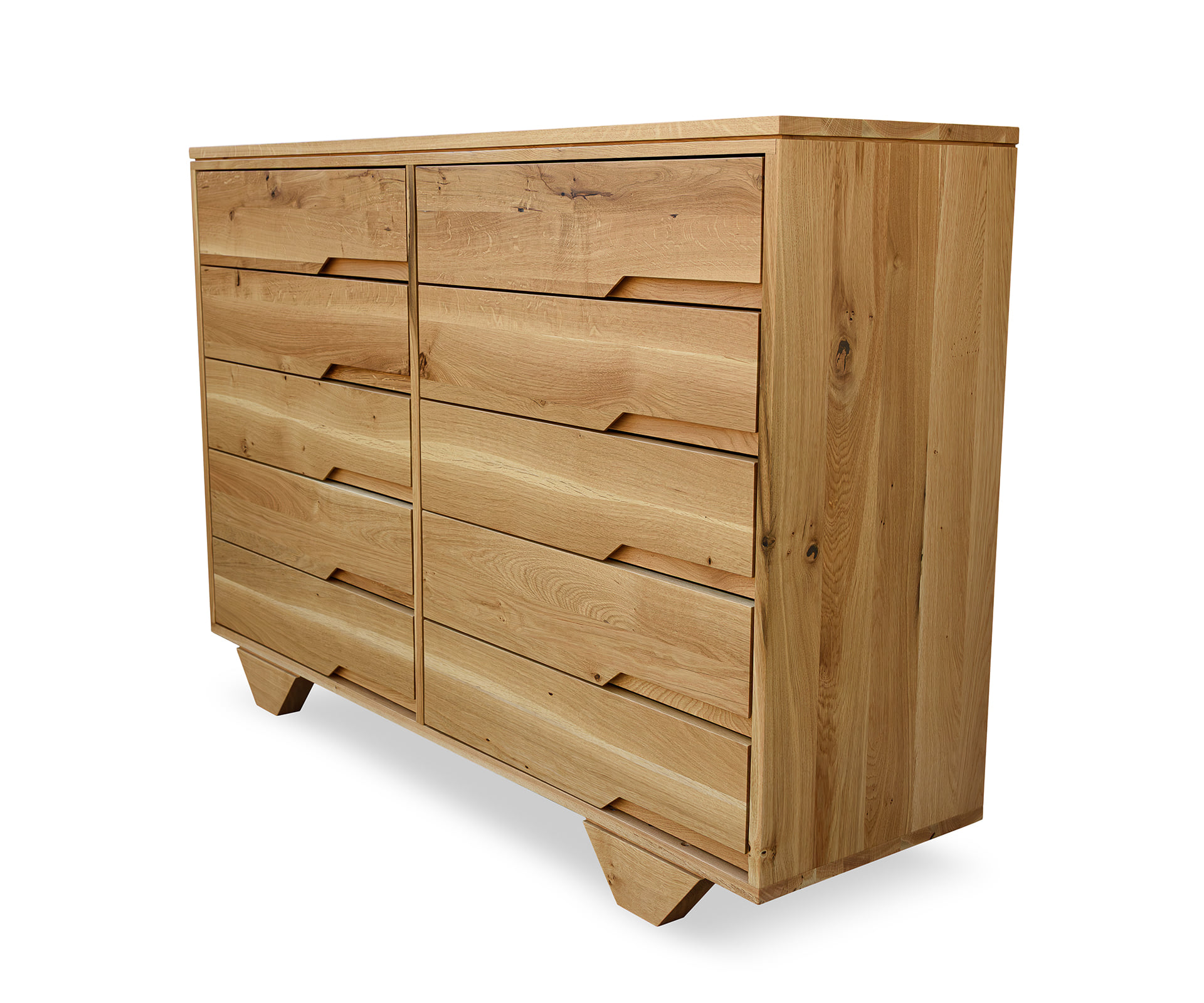Comoda realizată din lemn de stejar masiv, prevăzută cu zece sertare, este finisată cu poliuretan pe bază ulei și se remarcă printr-o construcție solidă, potrivită atât pentru living, cât și pentru dormitor. Produsă de Atelierul de Tâmplărie din Târgu Mureș, piesa are un design simplu, dar elegant, evidențiat de plăcile de stejar de cea mai bună calitate. Partea frontală este realizată dintr-o singură placă, ceea ce face ca sertarele să depășească rolul strict funcțional. Farmecul lor aparte este dat de îmbinările precise și de continuitatea naturală a fibrei lemnului.