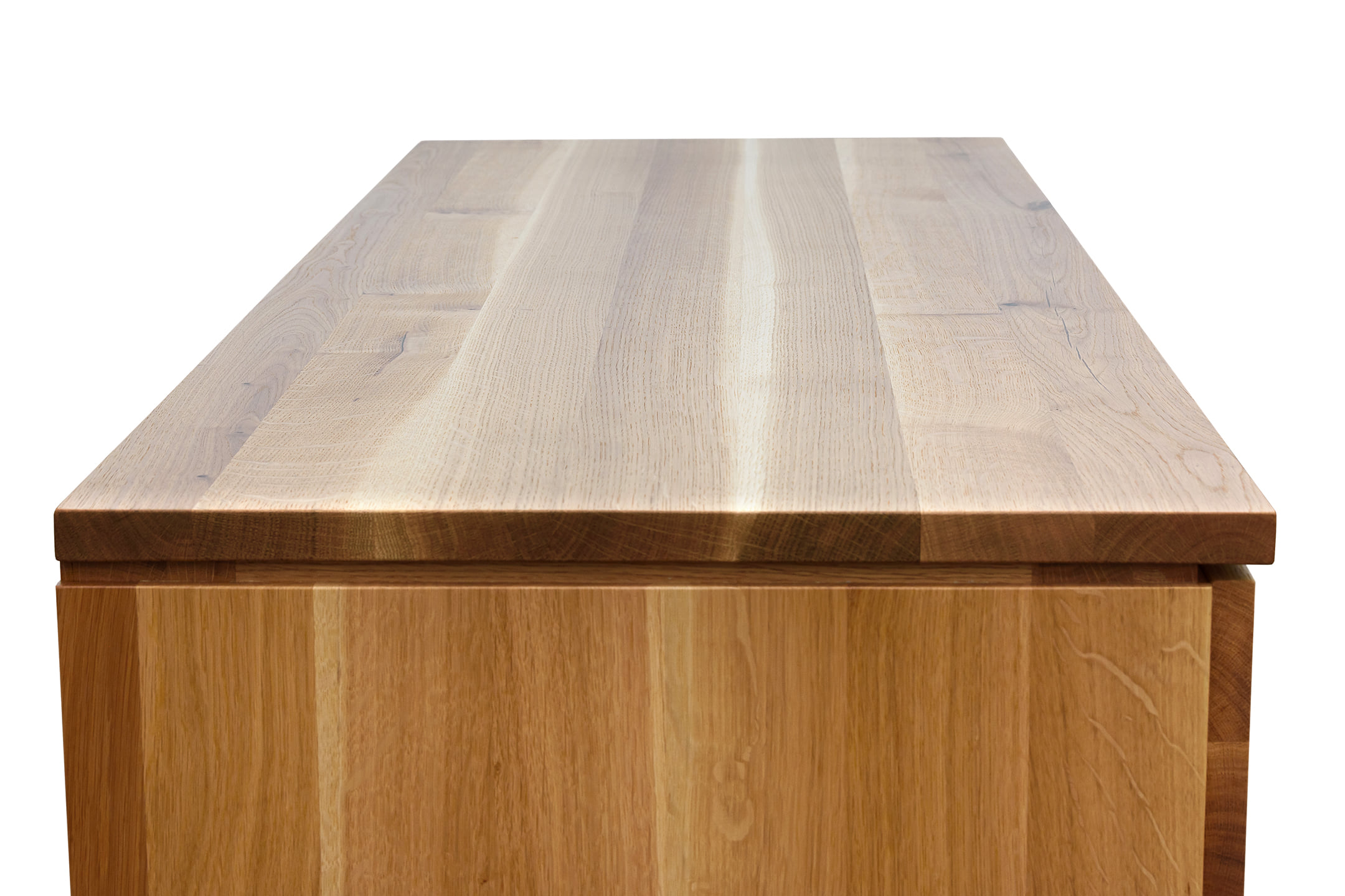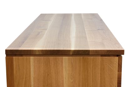 Comoda din lemn de stejar masiv prevăzută cu trei uși și trei sertare, are o constructie solida care se va potrivi in orice living sau dormitor. Comoda produsa de Atelierul de Tâmplărie din Târgu Mureș are o formă simplă dar totodata deosebita care este data de placile de de stejar de cea mai bună calitate. Fata comodei este realizata dintr-o singura placa, astfel că sertarele și usile nu au doar un rol funcțional. Aspectul lor deosebit este dat de imbinarile perfecte si continuitatea nervurilor lemnului.